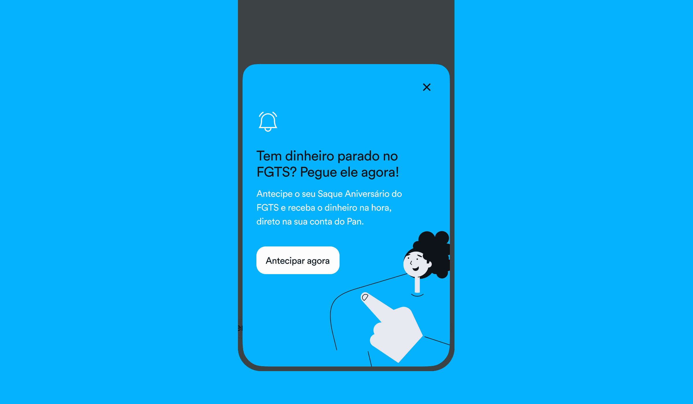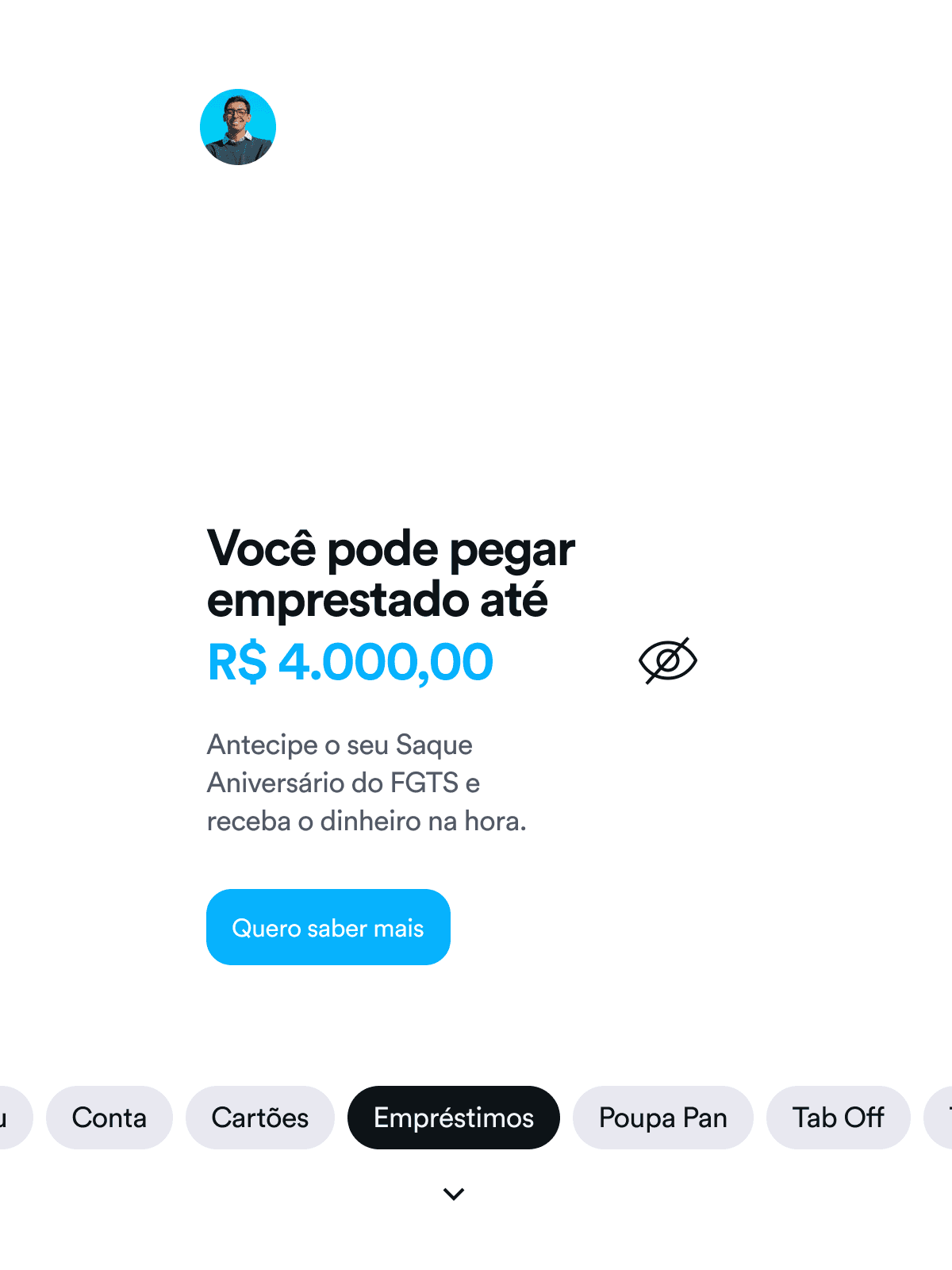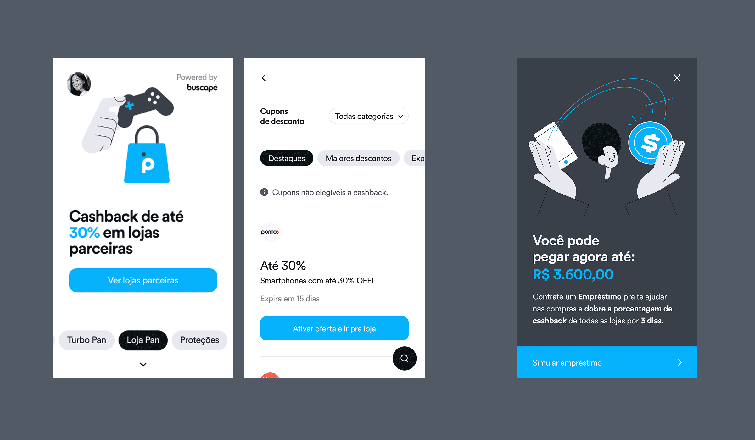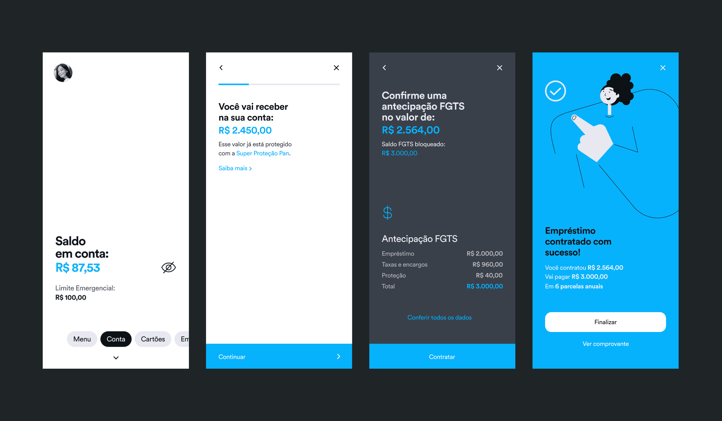 Durante minha atuação no Banco Pan, trabalhei em duas frentes estratégicas dentro do app: Empréstimo FGTS e Loja Pan.